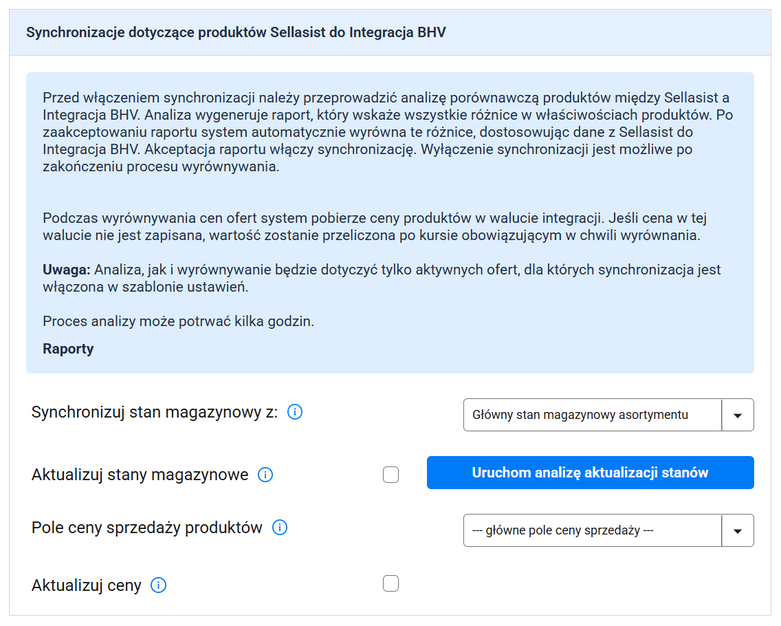 - Aktualizuj stany magazynowe: Uruchomienie synchronizacji stanów magazynowych produktów Sellasist → BHV. Więcej na temat analizy aktualizacji stanów dowiesz się z następnego akapitu.