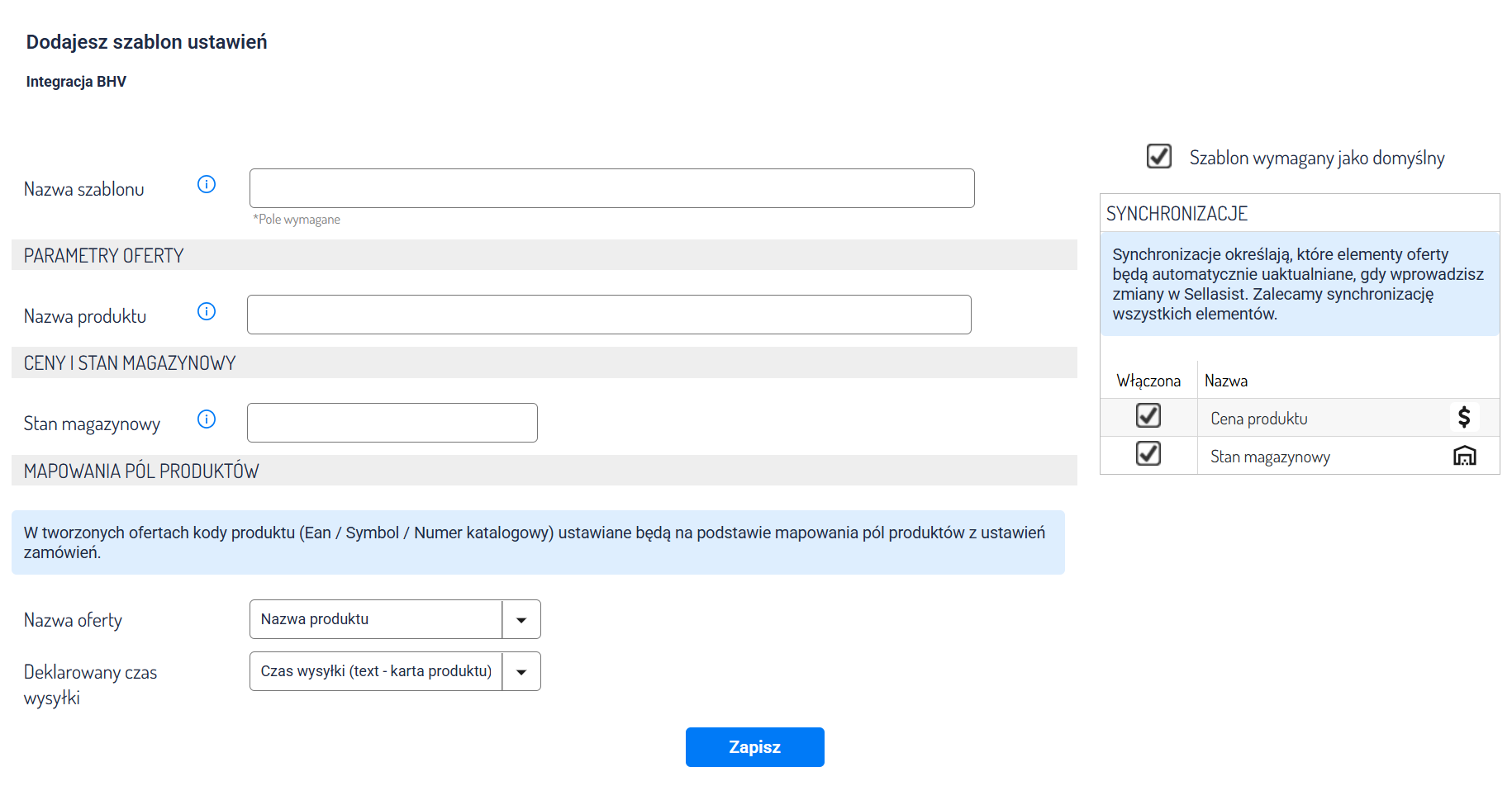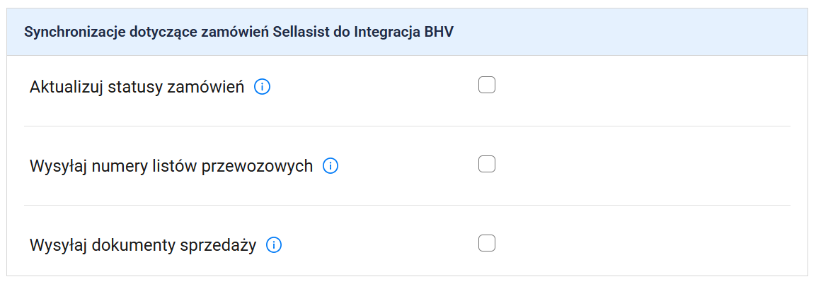 Uwaga: Synchronizacja działa wyłącznie w kierunku Sellasist → BHV.