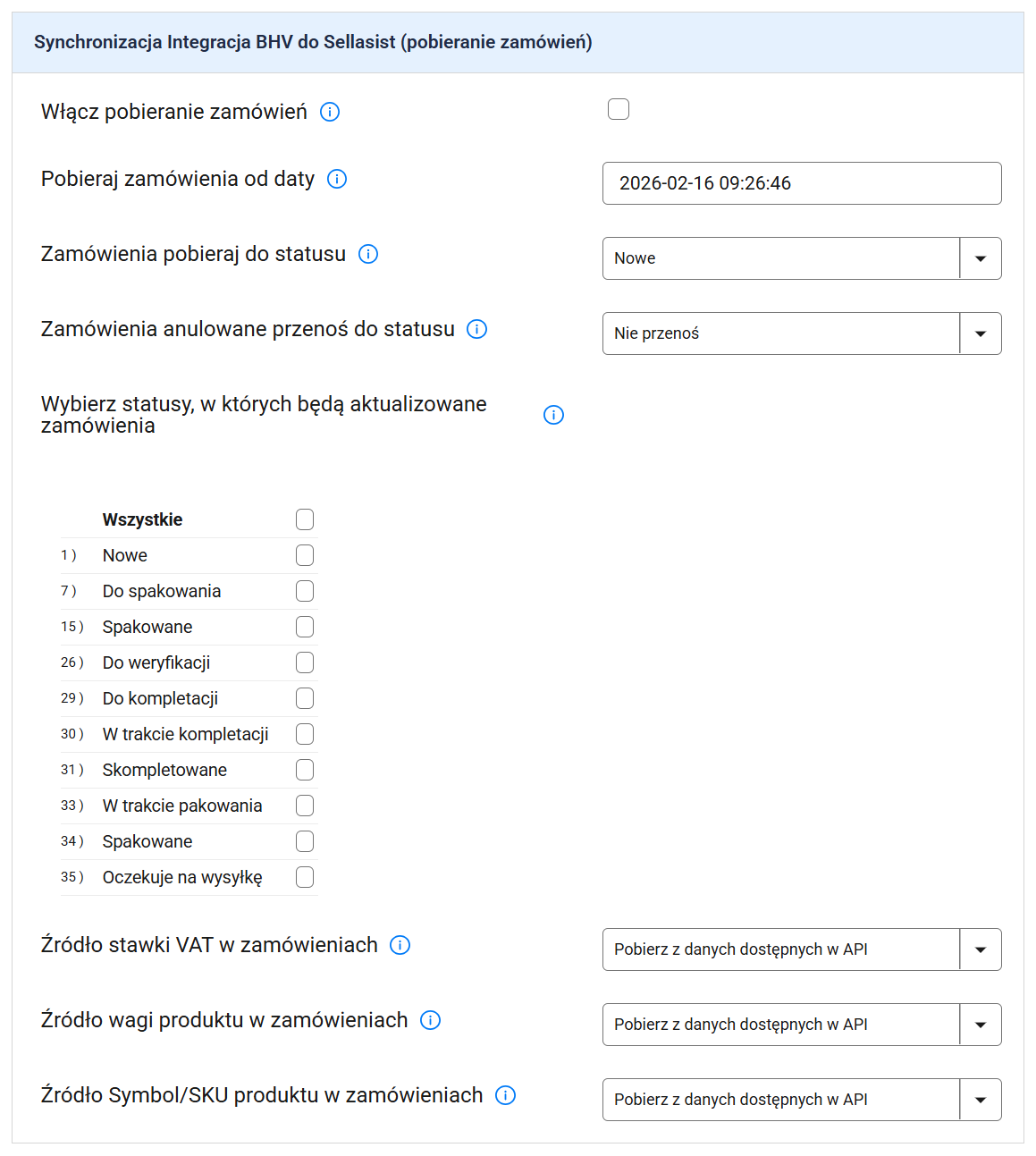 Sekcja: Synchronizacja BHV do Sellasist (pobieranie zamówień)