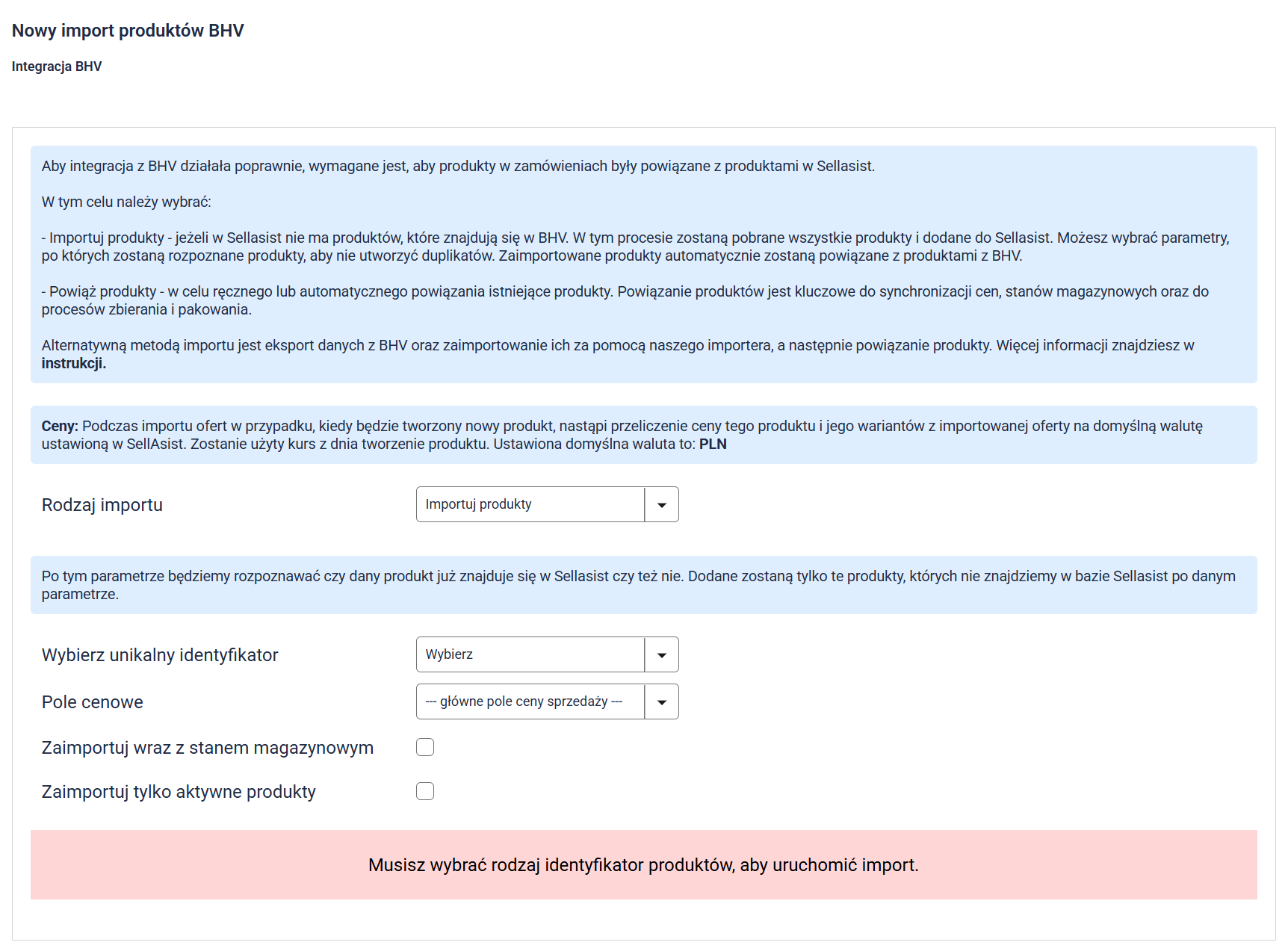 - Wybierz unikalny identyfikator: Parametr, po którym system będzie powiązywał produkty istniejące w Sellasist z produktami w BHV. Jeśli w Sellasist znajdzie się kilka pozycji z tym samym identyfikatorem, integracja zostanie przypisana do produktu o najniższym ID. Produkty, których nie uda się powiązać, zostaną wskazane w raporcie.