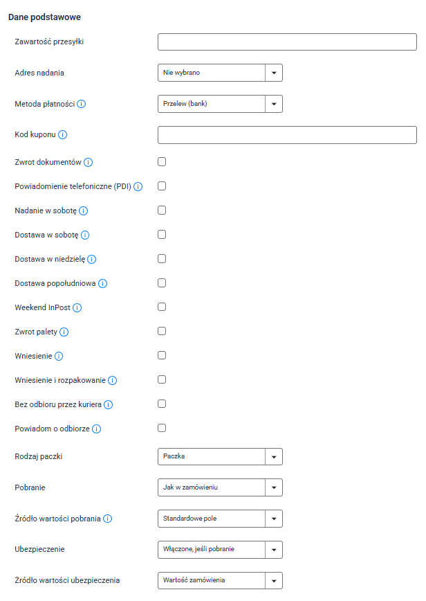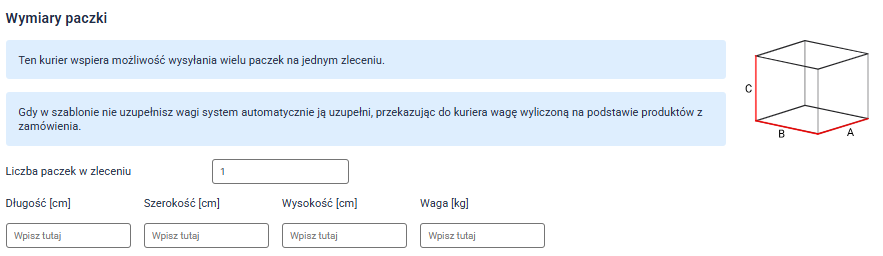 Wskazówka: Do jednego zamówienia możesz przypisać kilka paczek, przy czym każda zostanie nadana jako osobne zlecenie z własną etykietą. Kwota pobrania — jeśli występuje — zostanie proporcjonalnie podzielona pomiędzy paczki, a ubezpieczenie naliczone w pełnej wysokości dla każdej z nich. Jeśli szablon nie zawiera wagi, system obliczy ją automatycznie na podstawie produktów w zamówieniu.