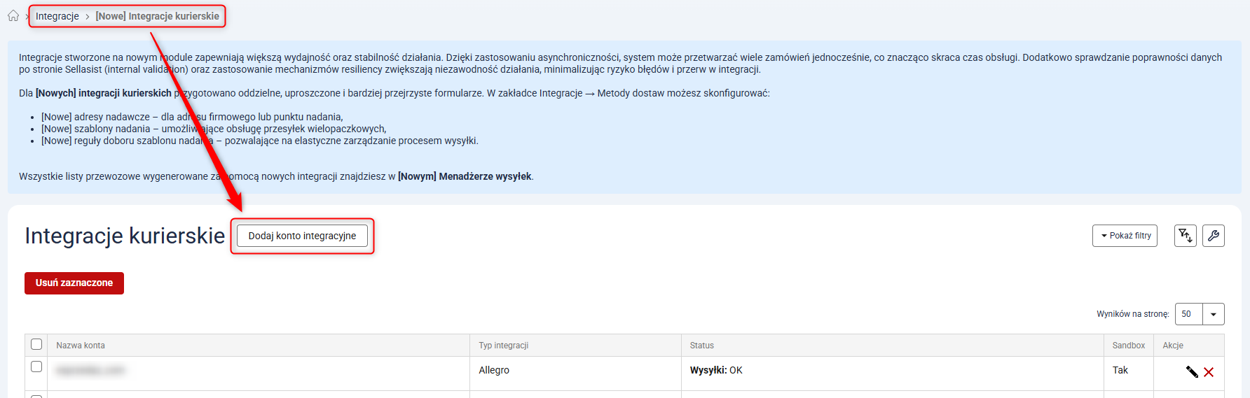 1. Przejdź do Integracje → [Nowe] Integracje kurierskie i kliknij przycisk Dodaj konto integracyjne.