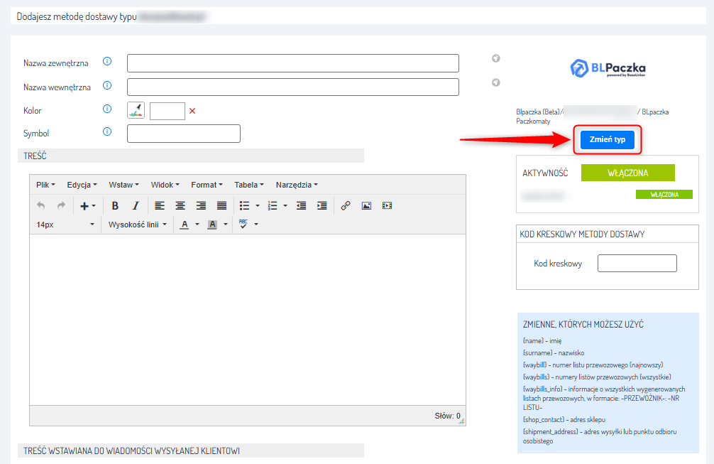3. Na ekranie zobaczysz formularz tworzenia nowej metody dostawy. Zmień typ usługi na właściwy Twojemu szablonowi nadania i skonfiguruj wszystkie ustawienia według własnych potrzeb.