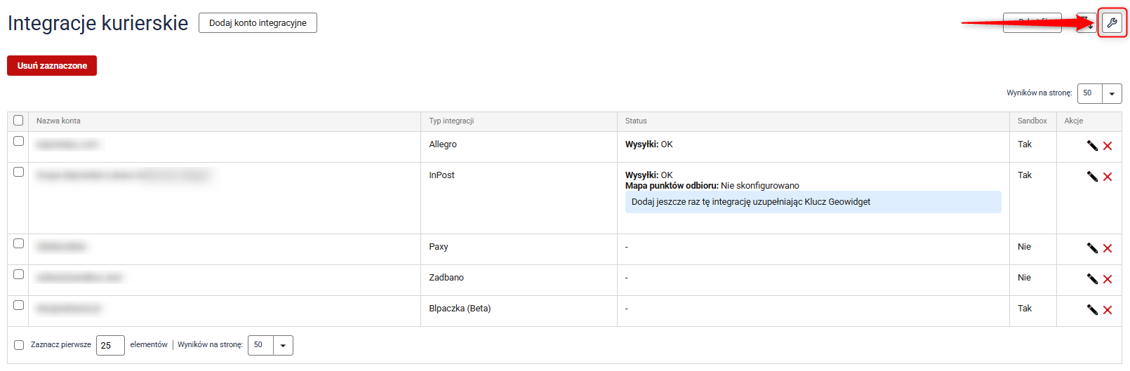 1. Przejdź do Integracje → [Nowe] Integracje kurierskie i kliknij przycisk z ikoną klucza.