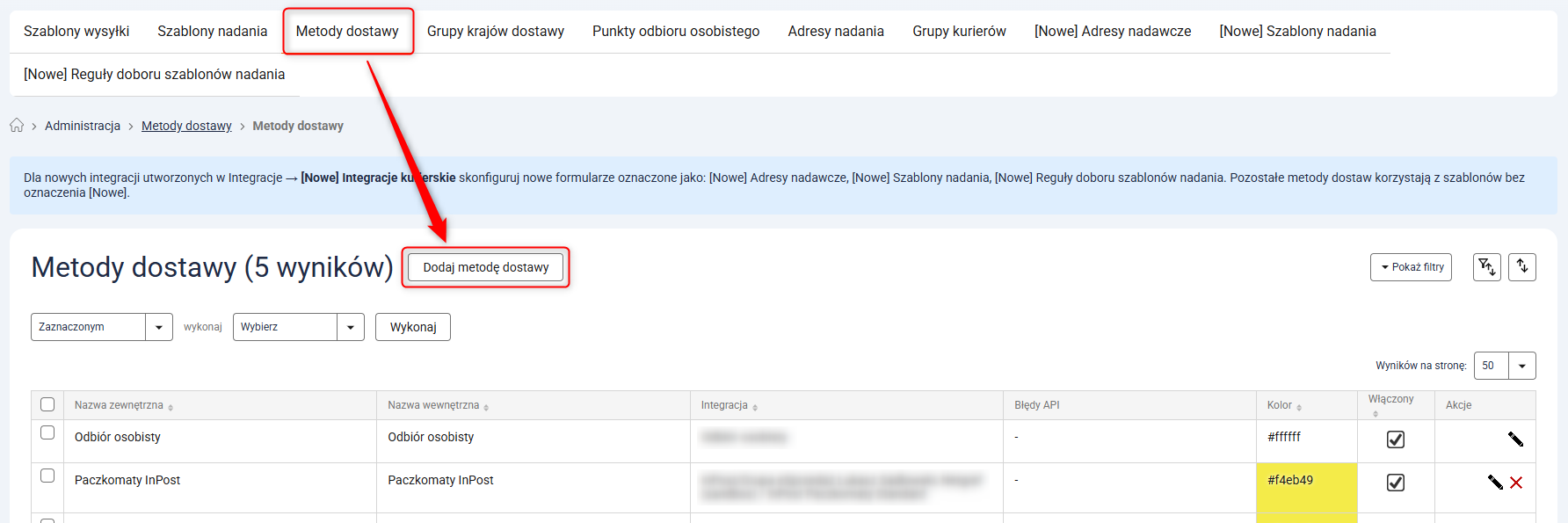 1. Przejdź do Administracja → Metody dostawy i kliknij przycisk Dodaj metodę dostawy.