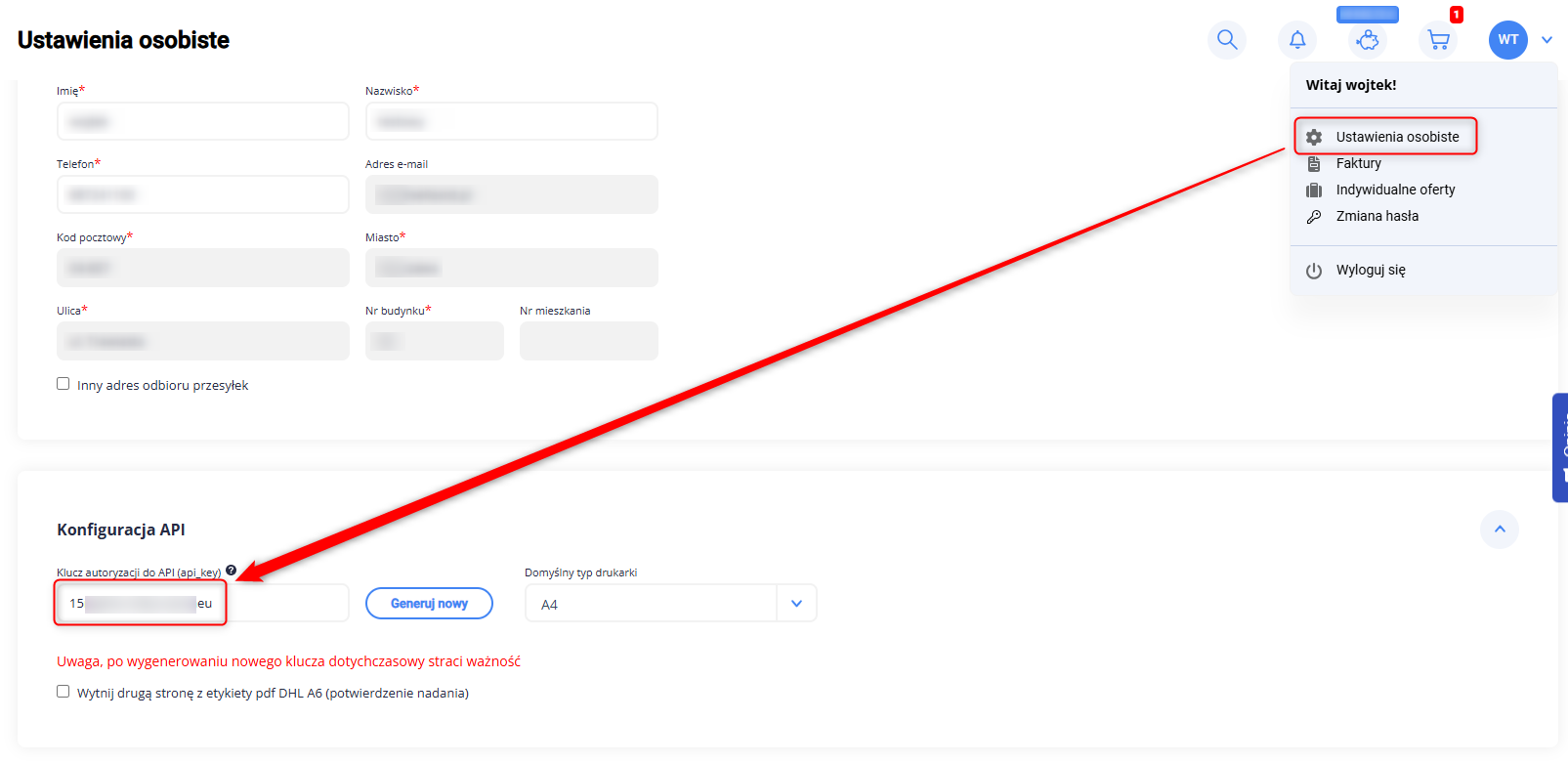 - Klucz API: Klucz autoryzacji do API, który znajdziesz w panelu BLPaczki (Ustawienia osobiste → Konfiguracja API).