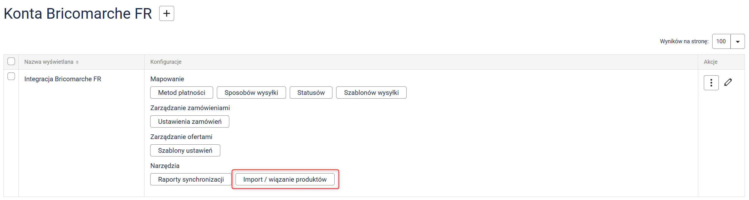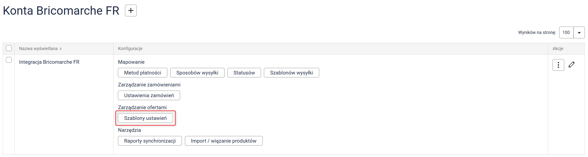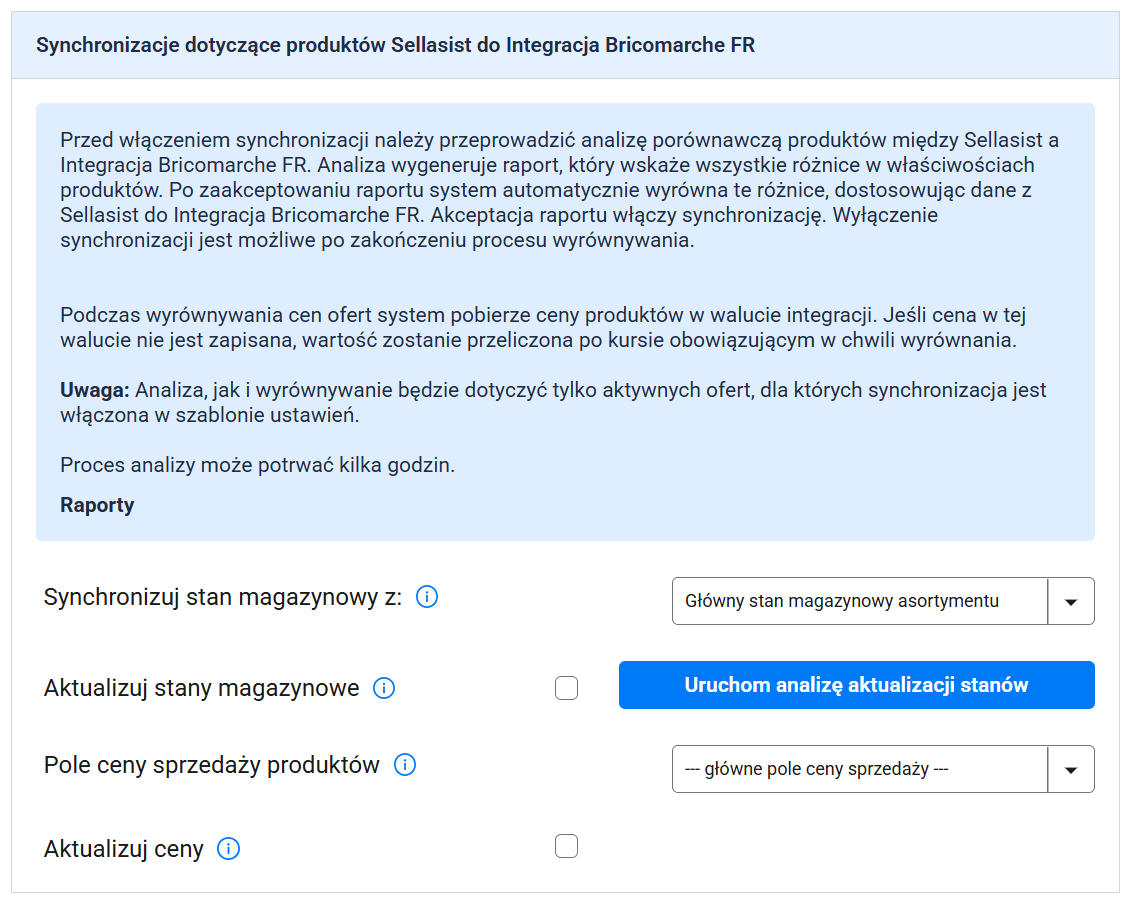 Uwaga: Oferty zostaną zsynchronizowane tylko wtedy, gdy w szablonie ustawień (krok 4) włączyłeś synchronizację stanów magazynowych oraz posiadasz przynajmniej jedną ofertę na Bricomarche FR. Głównym źródłem stanów magazynowych i cen są produkty. Jeśli w systemie znajdują się importowane oferty powiązane z produktem, ich wartości zostaną wyrównane do danych zapisanych w produkcie — i w ofercie Sellasist, i w ofercie integracji.