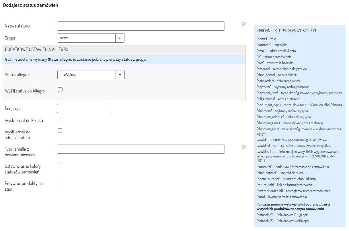 Podobnie jak w przypadku powiadomień, w systemie są dostępne statusy z przygotowaną treścią i podstawowymi zmiennymi. Klikając ikonę ołówka, możesz je edytować, dostosować do charakterystyki swojego sklepu lub dodać inne zmienne widoczne w przyborniku.