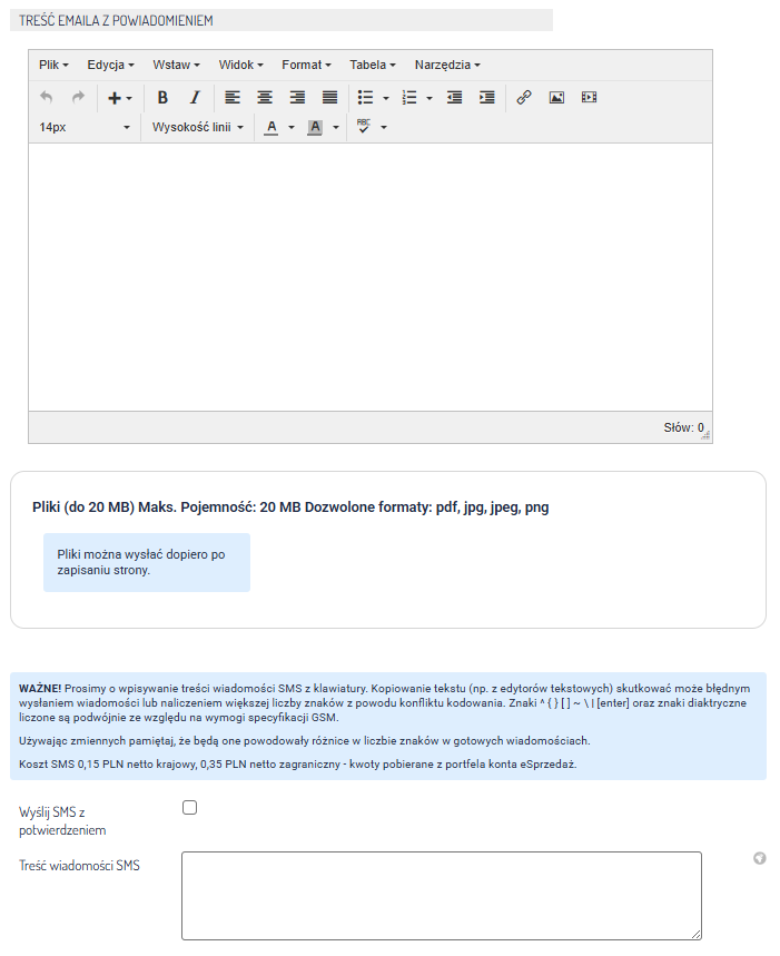 Uwaga: Aby wysyłać SMS-y z panelu administracyjnego, musisz doładować portfel na koncie eSprzedaż. Więcej na temat doładowywania portfela dowiesz się tutaj.