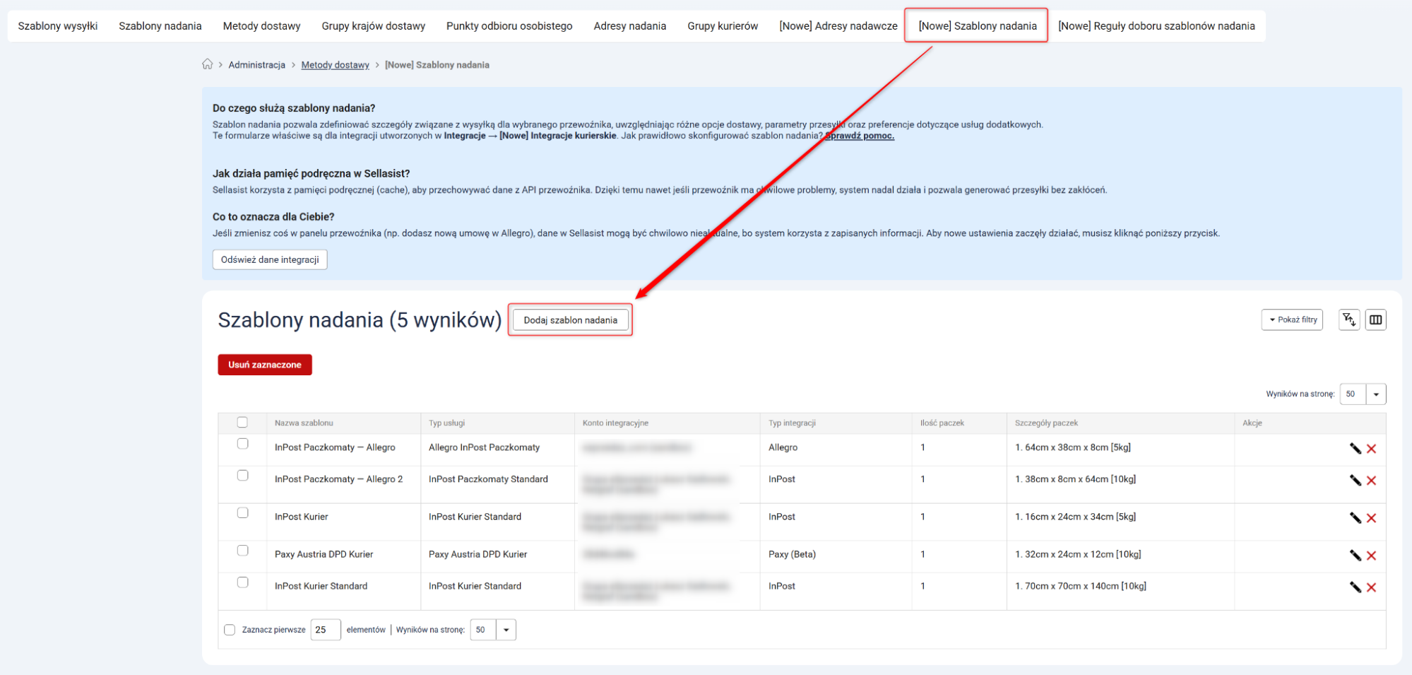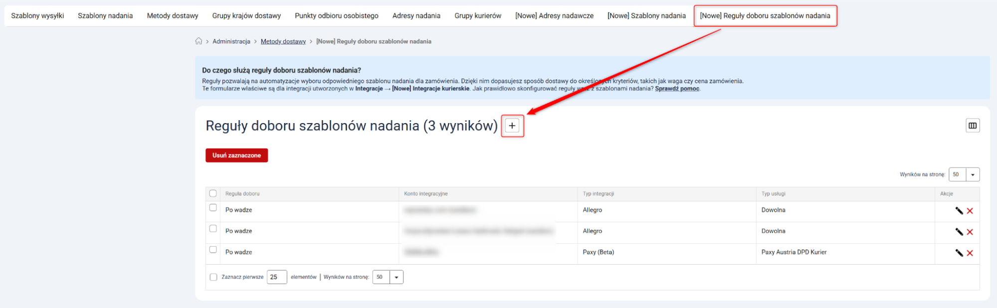 1. By stworzyć szablony przejdź do Administracja ⇨ Metody dostawy ⇨ [Nowe] Reguły doboru szablonów nadania.