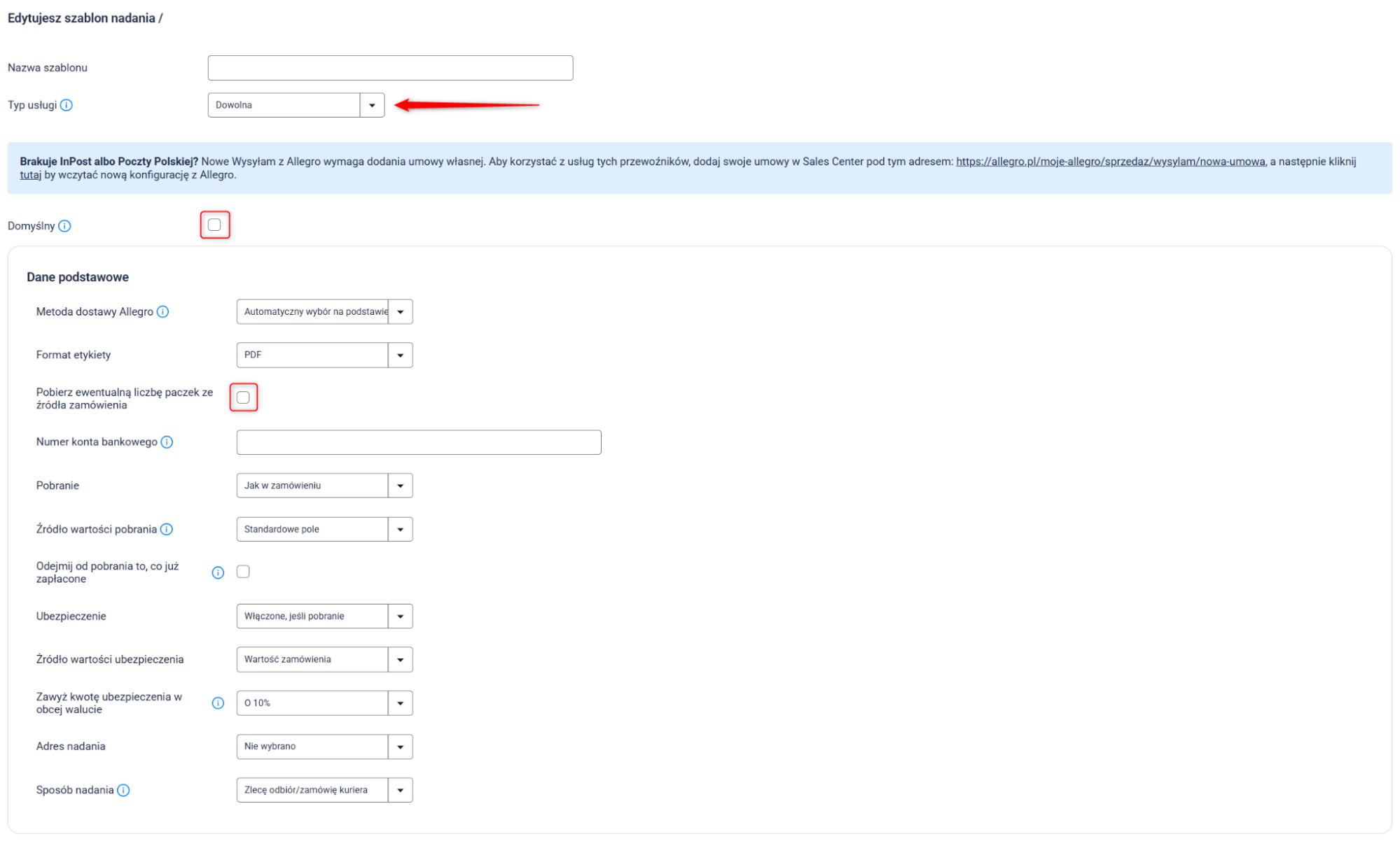 2. Uzupełnij formularz (przykład na podstawie dobierania szablonów nadania dla Allegro):