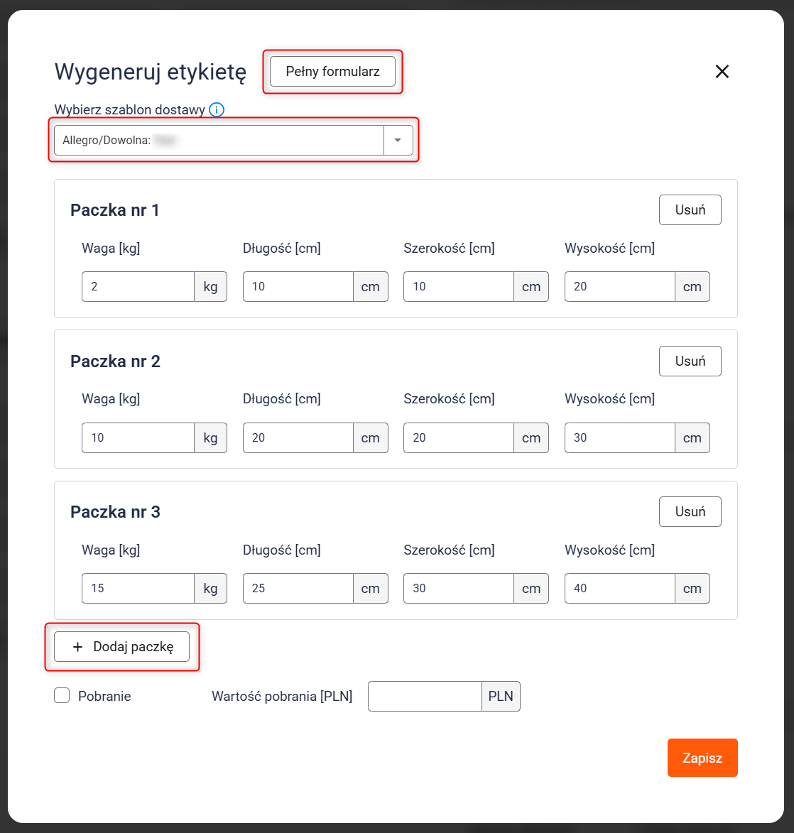 Możesz wpisać liczbę paczek w zleceniu oraz zdefiniować wymiary i wagę dla każdej z nich.