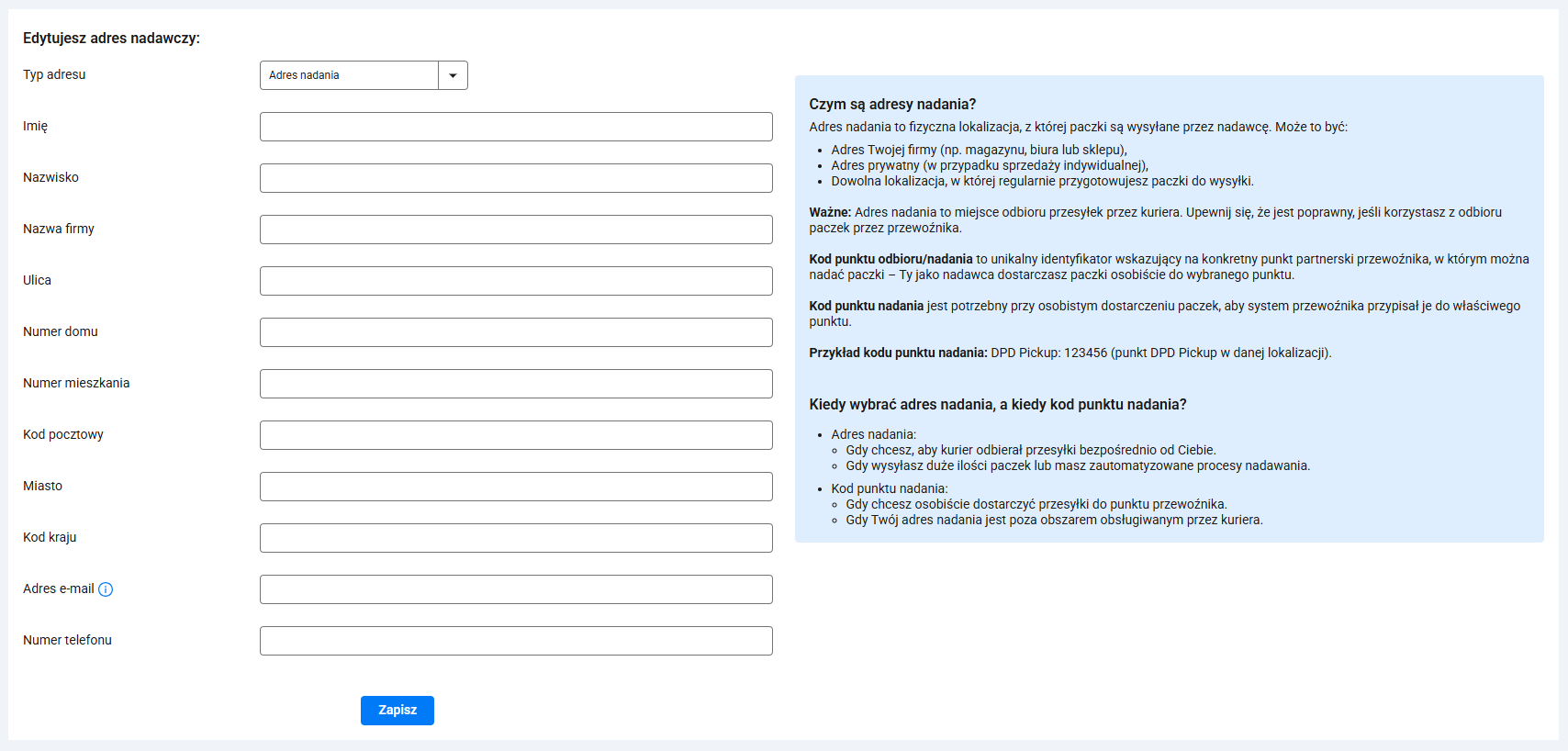 Adres nadania to miejsce, z którego wysyłasz paczki — np. magazyn, biuro, sklep czy adres prywatny. Jest to również lokalizacja odbioru przesyłek przez kuriera.