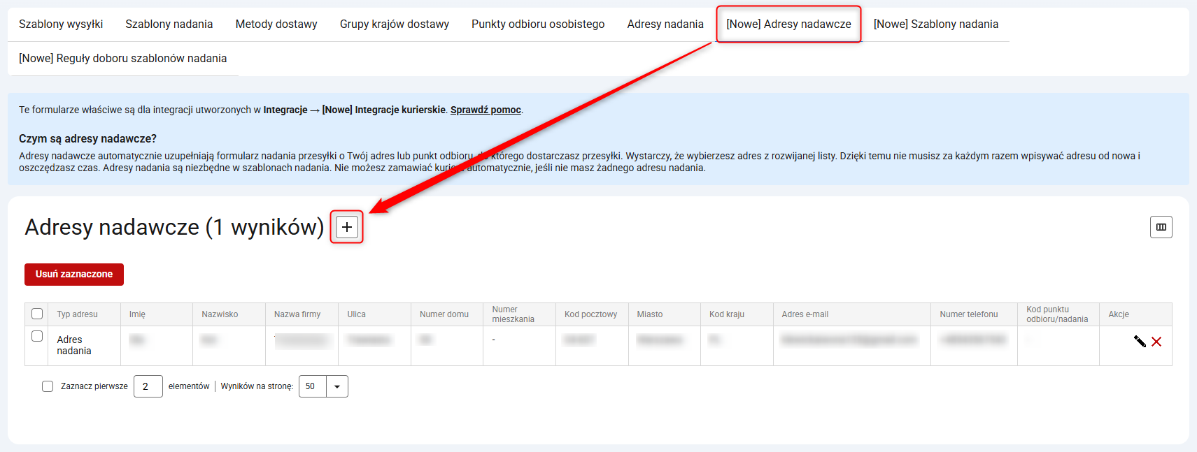 1. Przejdź do Administracja → Metody dostawy → [Nowe] Adresy nadawcze i kliknij przycisk z ikoną plusa.