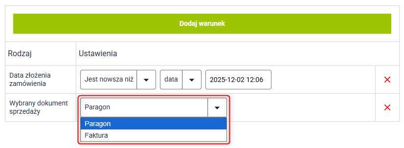 Jak skonfigurować warunek automatyzacji Dokument w akcjach dla zamówień?