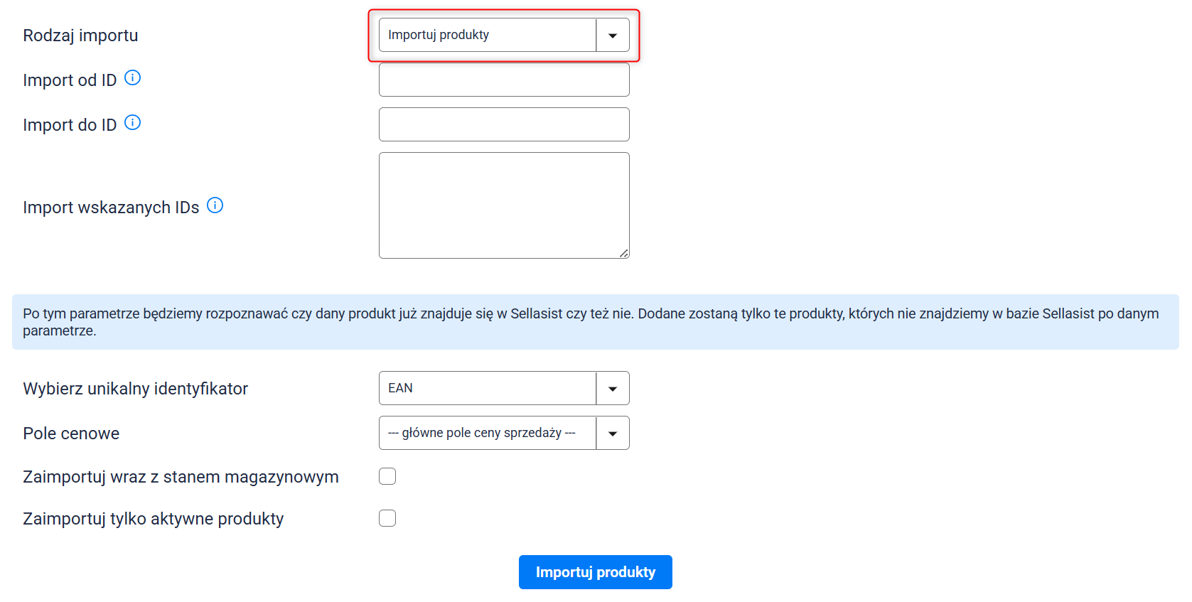 - Import wskazanych IDs: Import wyłącznie wybranych produktów o wskazanym ID.