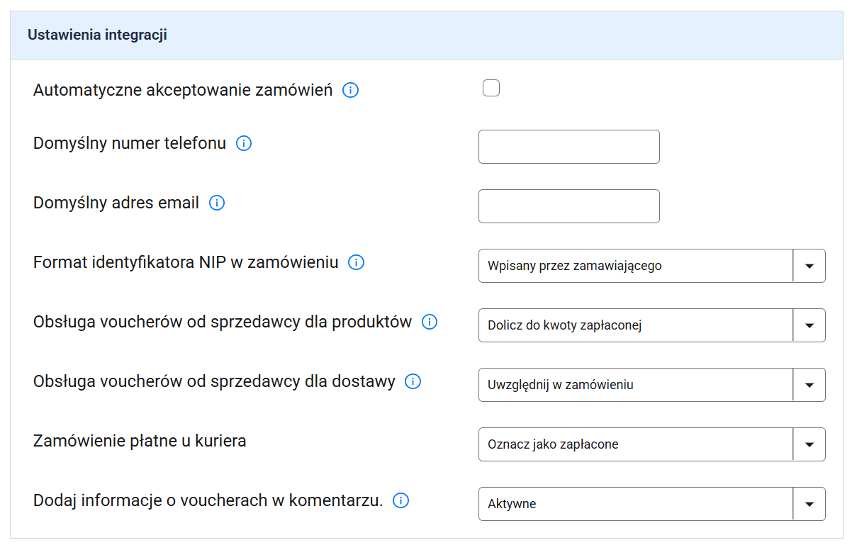 - Domyślny adres email: Adres e-mail używany w zamówieniach, jeśli e-mail z integracji nie jest dostępny.
