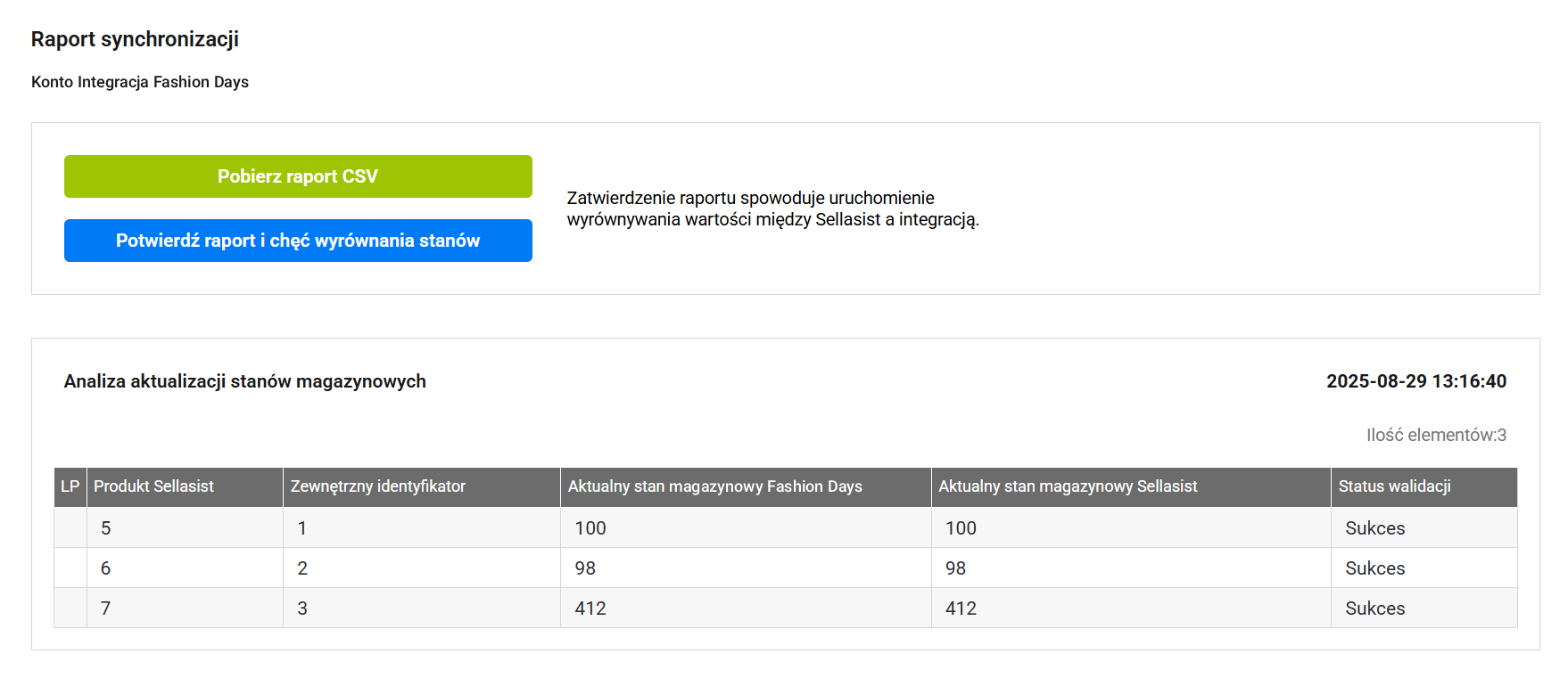 Przed uruchomieniem synchronizacji system porówna produkty między Sellasist a Fashion Days. Na tej podstawie powstanie raport wskazujący wszystkie różnice w właściwościach produktów. Po akceptacji raportu system zaktualizuje dane produktów w Fashion Days na podstawie danych z Sellasist, a synchronizacja zostanie włączona.