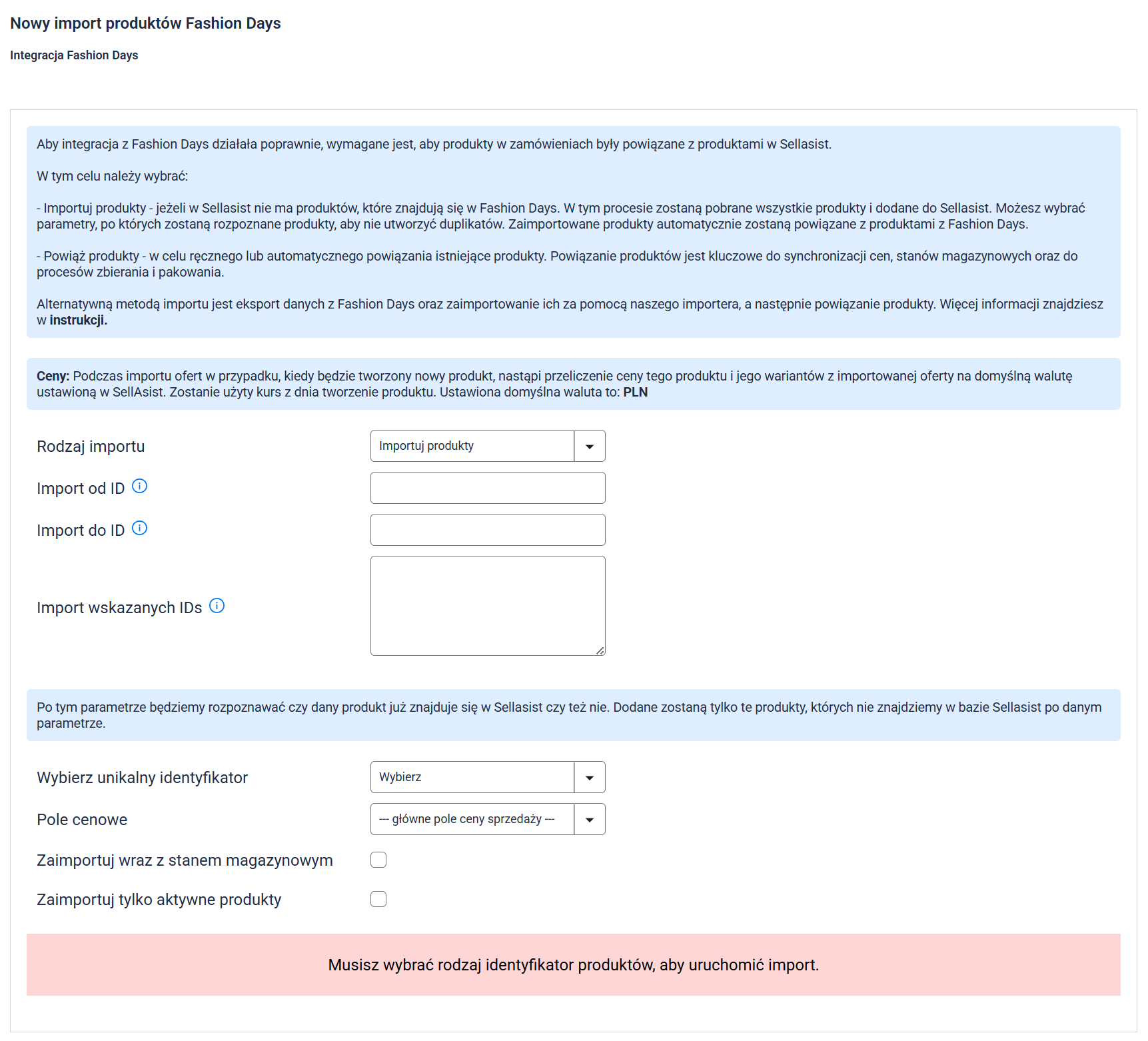 - Wybierz unikalny identyfikator: Parametr, po którym system będzie powiązywał produkty istniejące w Sellasist z produktami w Fashion Days. Jeśli w Sellasist znajdzie się kilka pozycji z tym samym identyfikatorem, integracja zostanie przypisana do produktu o najniższym ID. Produkty, których nie uda się powiązać, zostaną wskazane w raporcie.