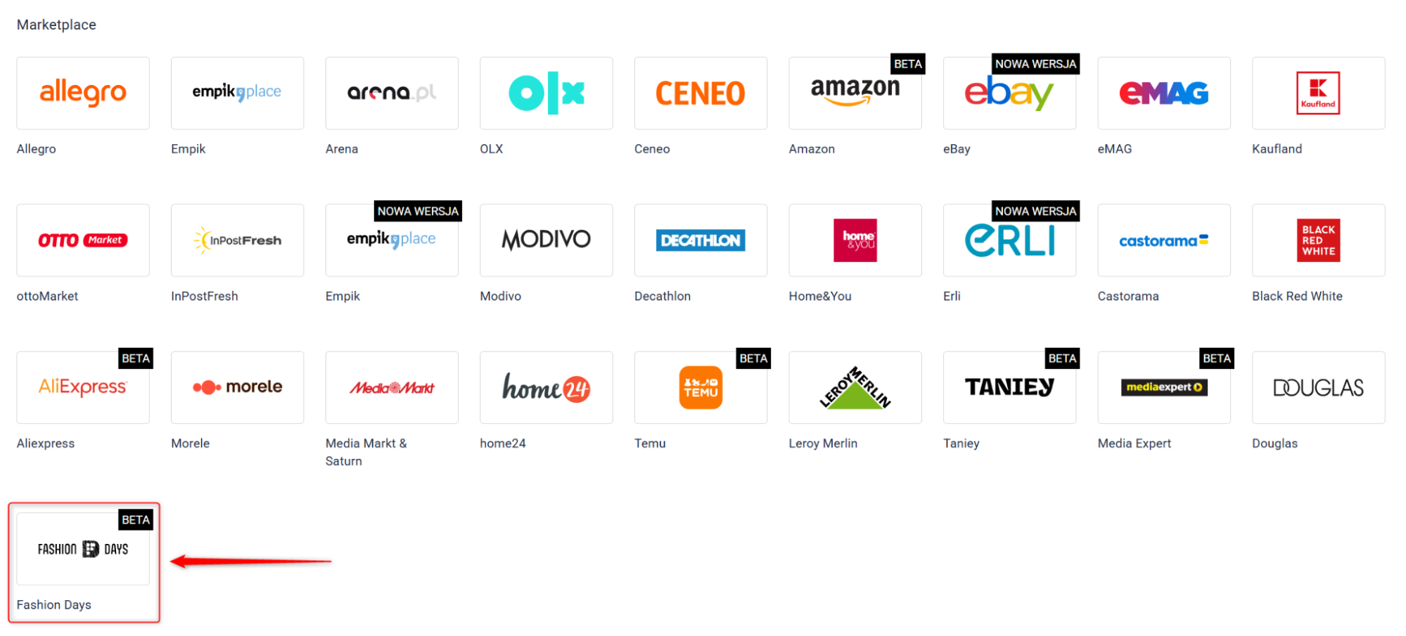 1. Przejdź do Integracje → Dodaj nową integrację i w sekcji Marketplace wybierz Fashion Days.