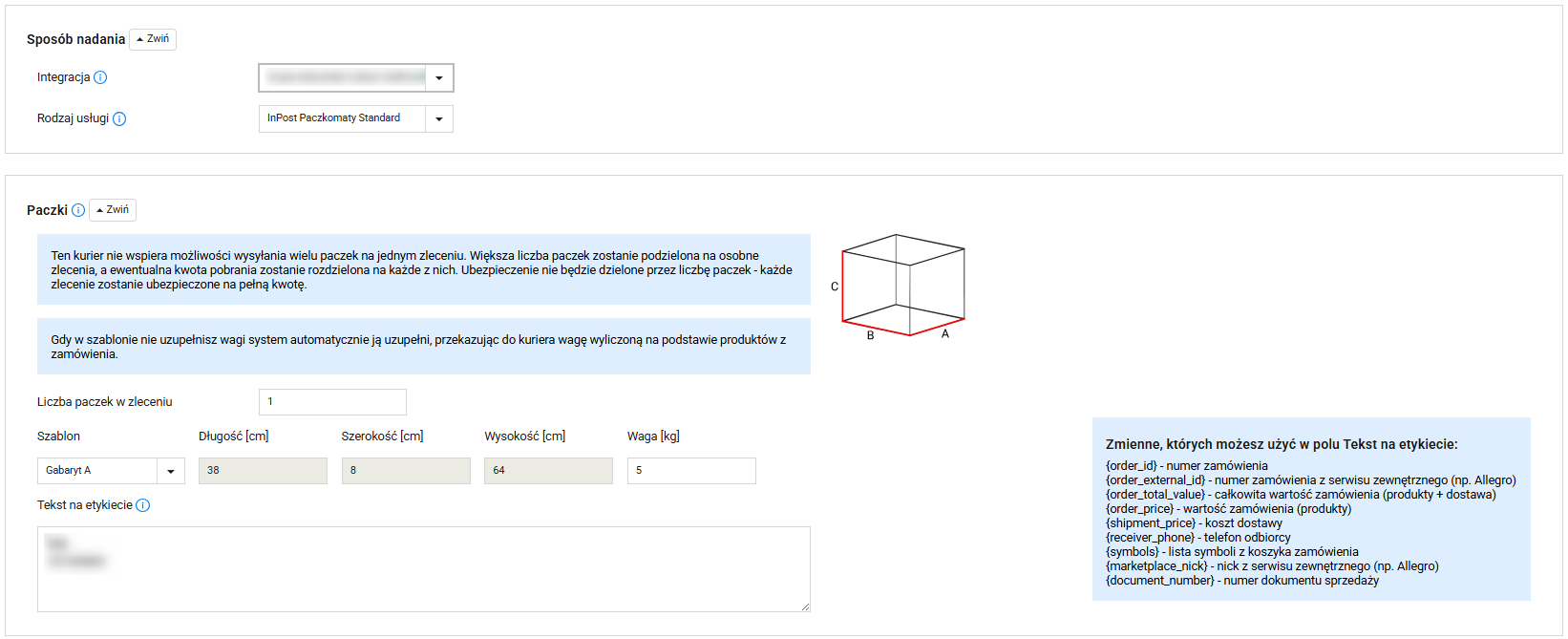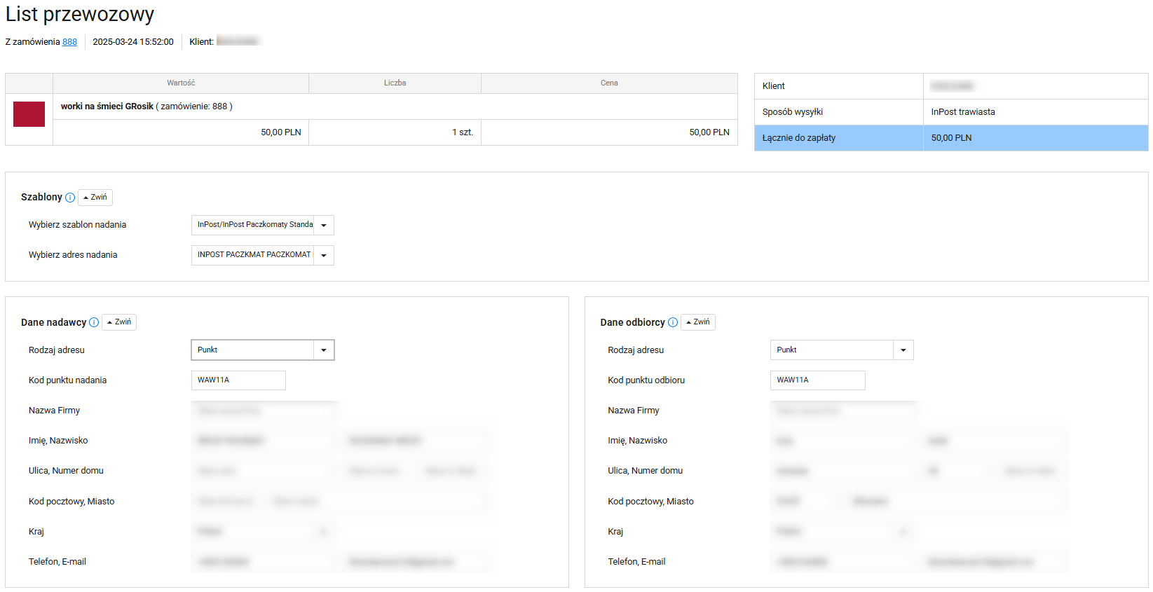 Na karcie zamówienia zobaczysz automatycznie przypisany szablon nadania (np. dla InPost).