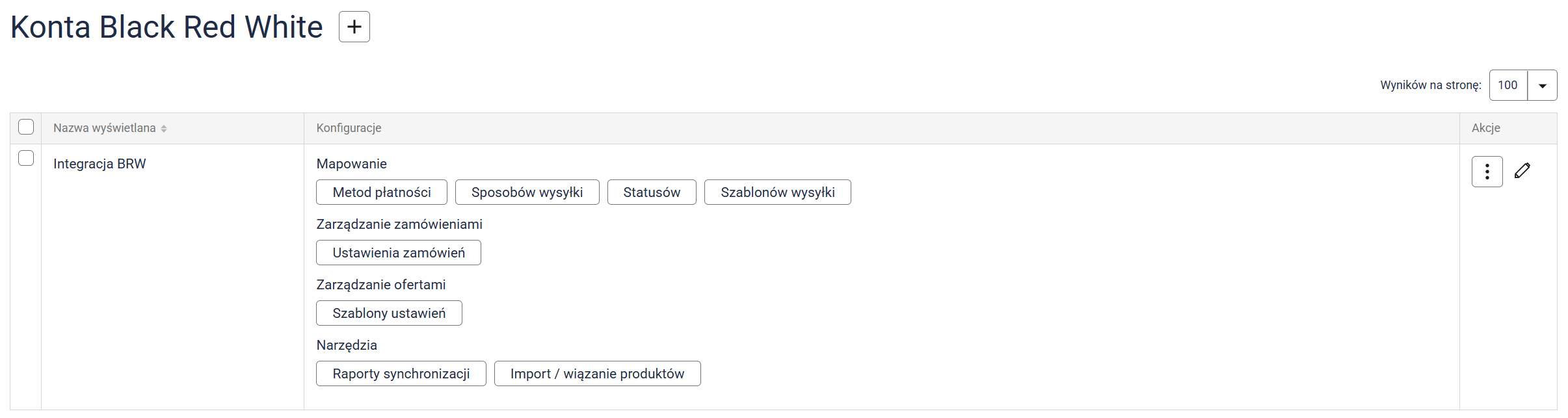 W panelu użytkownika, po utworzeniu nowego konta, obok nazwy konta Black Red White zostaną wyświetlone możliwe konfiguracje konta, takie jak mapowanie metod płatności, metod sposobów wysyłki, statusów zamówień, ustawienia zamówień, szablony ustawień, importy produktów oraz raporty synchronizacji.