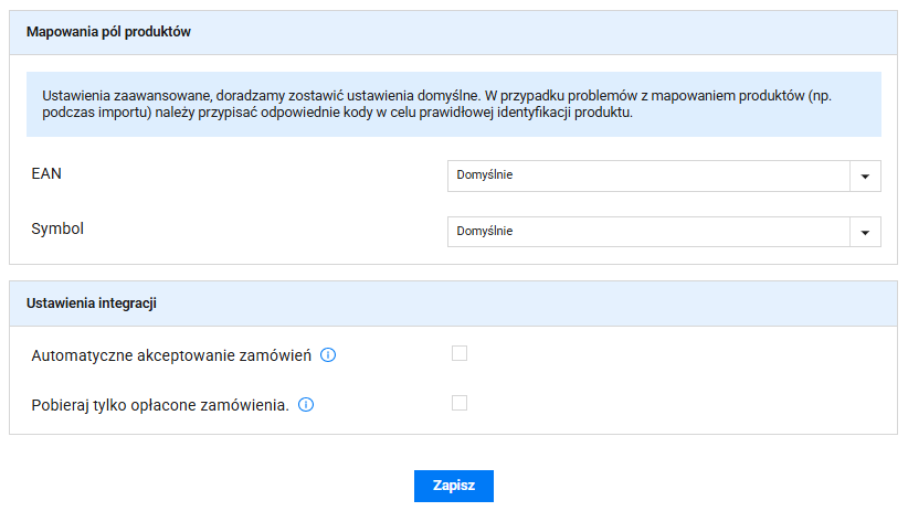 Ustawienia zaawansowane, doradzamy zostawić ustawienia domyślne. W przypadku problemów z mapowaniem produktów (np. podczas importu) należy przypisać odpowiednie kody w celu prawidłowej identyfikacji produktu.