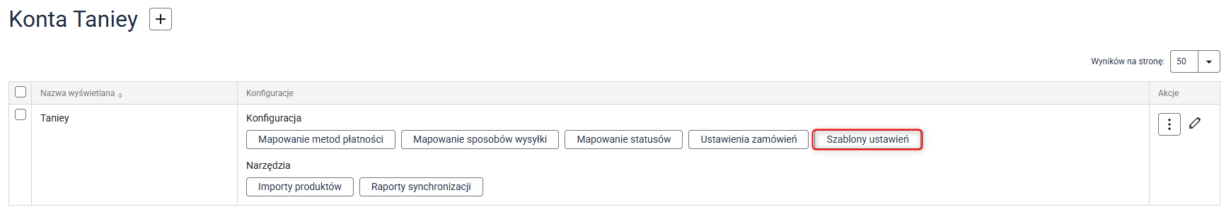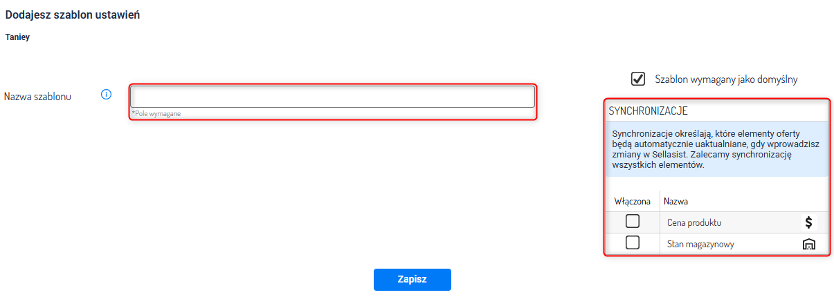 Uwaga: Ten krok jest wymagany przed uruchomieniem importu. Jeśli nie skonfigurujesz przynajmniej jednego szablonu oznaczonego jako Domyślny, import ofert nie będzie możliwy. Szablon domyślny jest automatycznie przypisywany do nowych ofert i aktualizuje ich ustawienia synchronizacji zgodnie z własną konfiguracją.