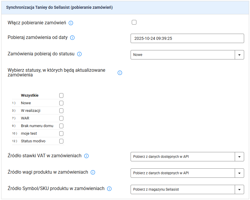 - Włącz pobieranie zamówień: Aktywacja/dezaktywacja pobierania zamówień z konta Taniey do Sellasist. Uwaga: Obecnie system pobiera wyłącznie zamówienia o statusie Niewysłane.