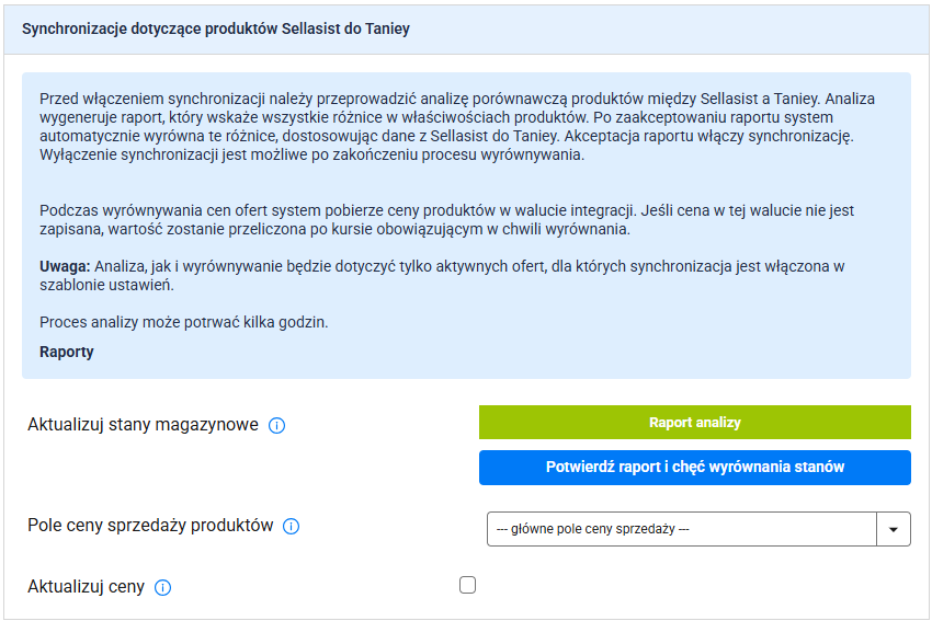 - Aktualizuj ceny: Uruchomienie synchronizacji cen produktów Sellasist → Taniey.