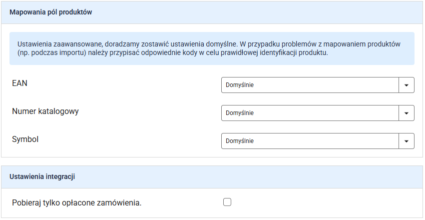 - Źródło Symbol/SKU produktu w zamówieniach: Źródło identyfikatorów (Symbol/SKU) produktów w pobieranych zamówieniach.