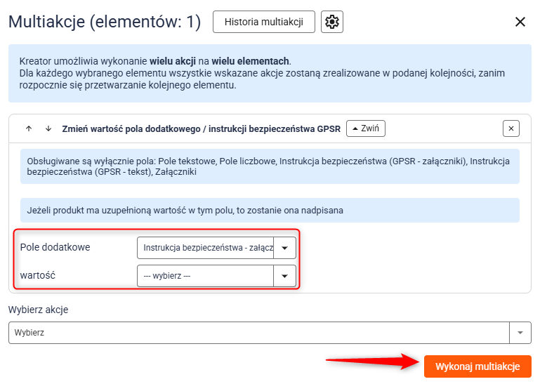 Masowo – przechodząc do zakładki Asortyment ⇨ Produkty na liście produktów zaznacz wybrane produkty, używając multiakcji Zmień wartość pola dodatkowego / instrukcji bezpieczeństwa GPSR.
