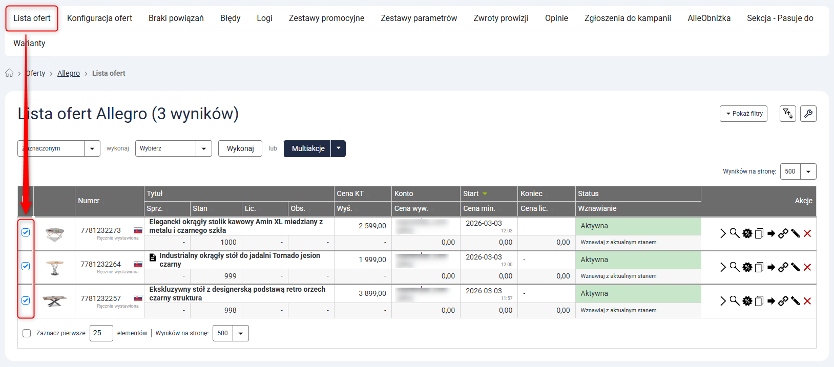 1. Przejdź do Oferty → Allegro → Lista ofert i zaznacz wybrane oferty.