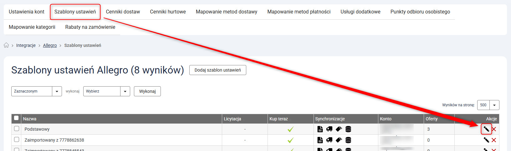 1. Przejdź do Integracje → Allegro → Szablony ustawień → Edycja wybranego szablonu.