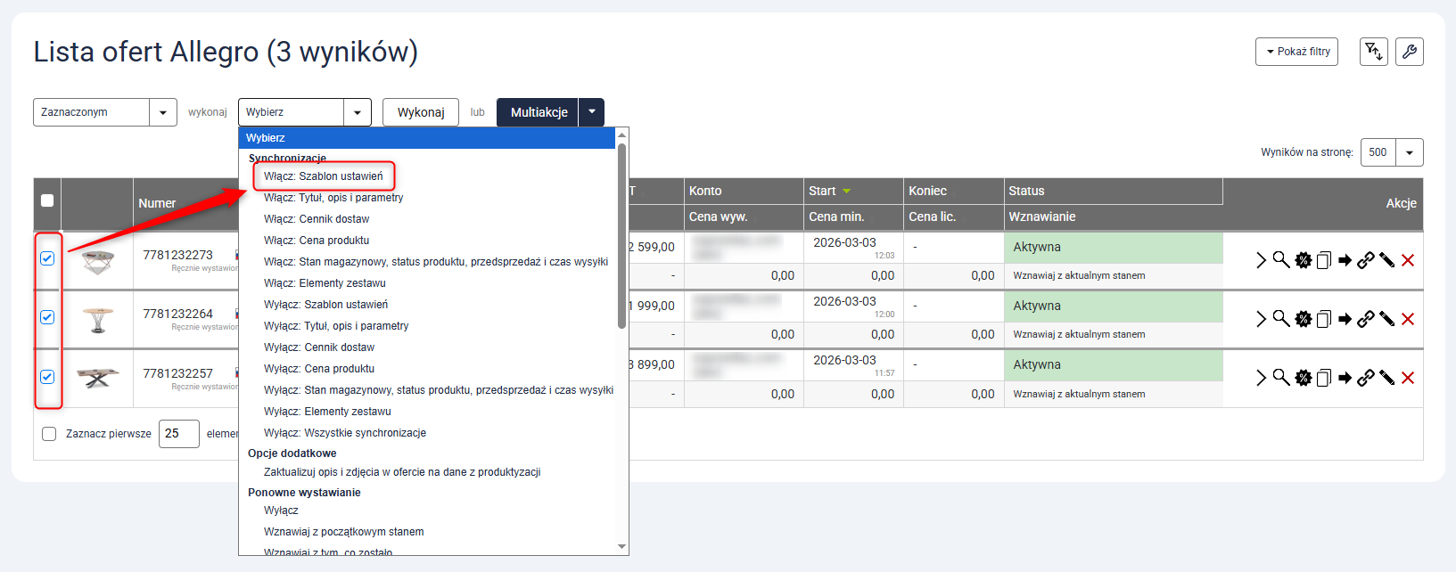 Wskazówka: Możesz także masowo uruchomić synchronizację, zaznaczając na liście ofert wybrane pozycje i z rozwijanej listy akcji wybierając Włącz: Szablon ustawień (screen poniżej).
