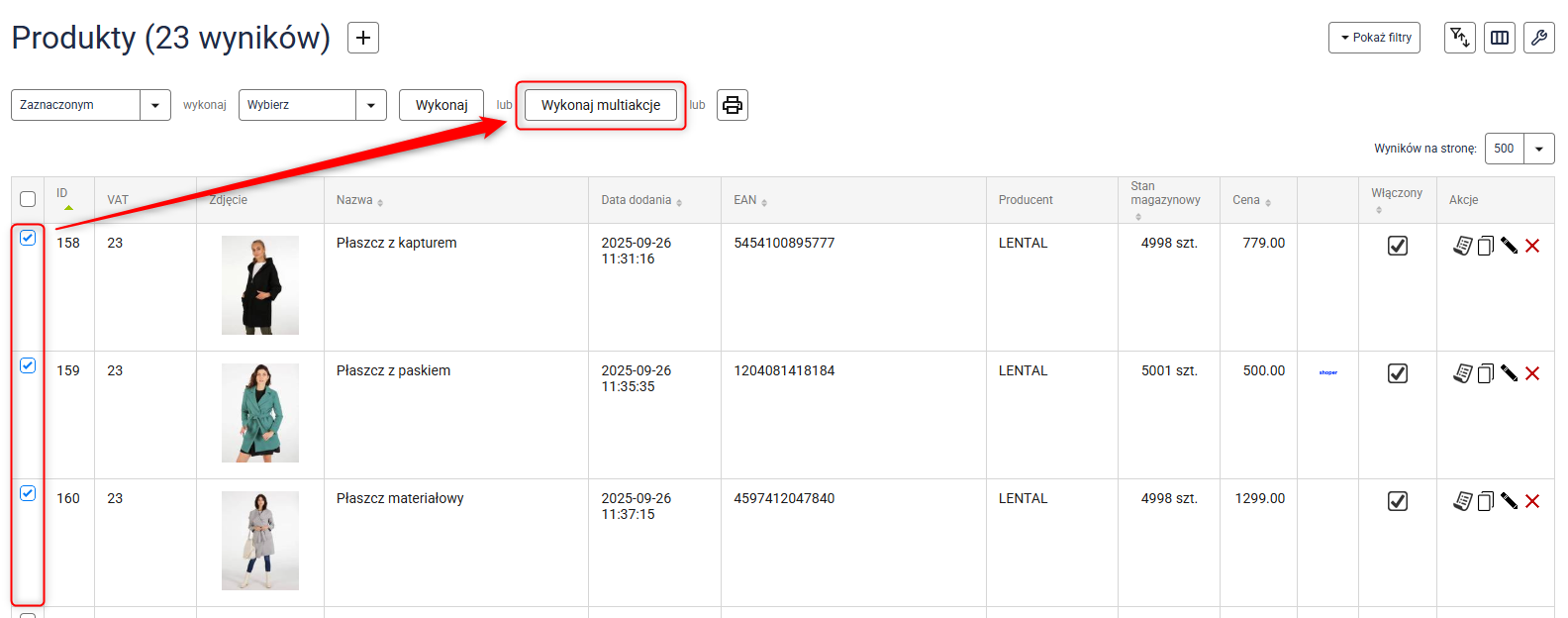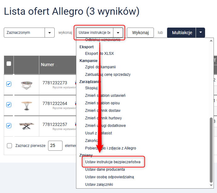 Przejdź do Asortyment → Produkty, zaznacz produkty, którym chcesz uzupełnić instrukcje bezpieczeństwa i kliknij przycisk Wykonaj multiakcje.