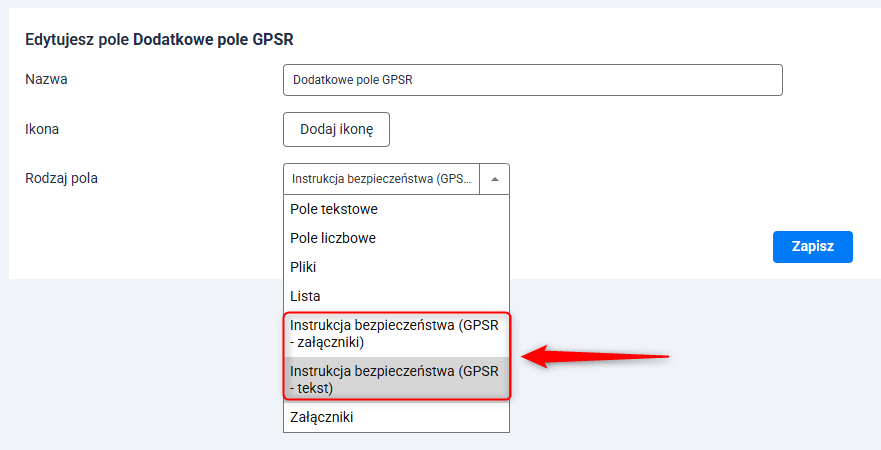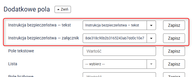 Przejdź do Asortyment → Produkty → Wybrany produkt i w sekcji Dodatkowe pola znajdź nowo utworzone pola dla instrukcji bezpieczeństwa. Z rozwijanej listy wybierz wcześniej utworzone instrukcje i kliknij przycisk Zapisz.