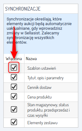 3. Upewnij się, że w ofertach, które chcesz synchronizować, masz włączoną synchronizację szablonu ustawień. W tym celu przejdź do Oferty → Allegro → Wybrana oferta i w sekcji Synchronizacje zaznacz opcję Szablon ustawień.