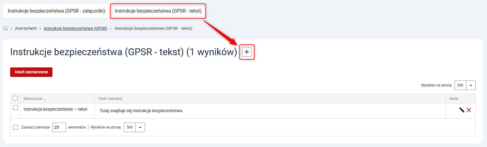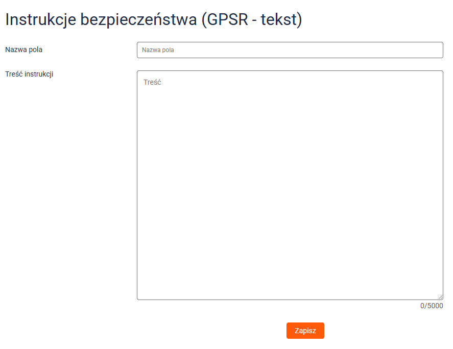 1. Przejdź do Asortyment → Instrukcje bezpieczeństwa (GPSR) → Tekst i kliknij przycisk Dodaj instrukcje bezpieczeństwa.