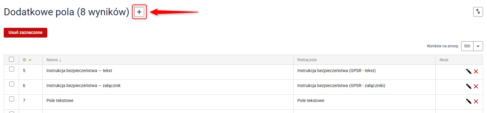 1. Przejdź do Asortyment → Dodatkowe pola i kliknij przycisk z ikoną plusa.