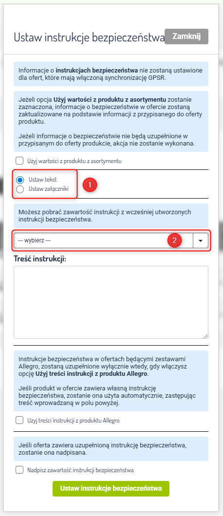 Instrukcję bezpieczeństwa możesz dodać jako załącznik lub tekst (Asortyment → Instrukcje bezpieczeństwa (GPSR)).