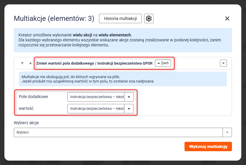 Z rozwijanej listy akcji wybierz Zmień wartość pola dodatkowego / instrukcji bezpieczeństwa GPSR. Następnie wybierz rodzaj instrukcji i konkretną instrukcję, którą chcesz dodać do wszystkich zaznaczonych produktów i kliknij przycisk Wykonaj multiakcję.