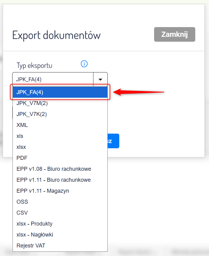 4. Wybierz eksport dokumentów sprzedażowych i skonfiguruj opcje eksportu.