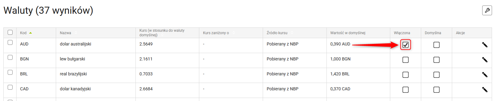 1. Przejdź do Administracja → Waluty i włącz wybraną walutę.