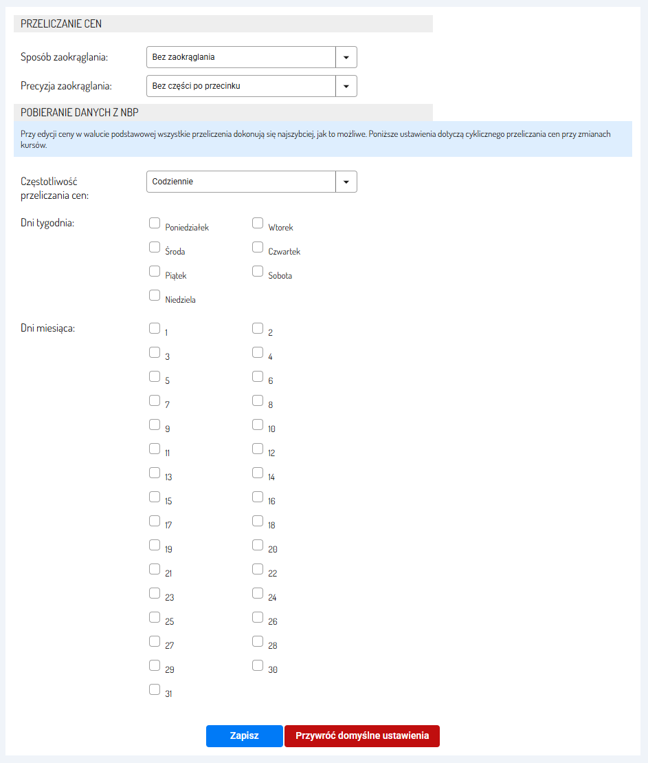 Dla każdego języka możesz przypisać walutę oraz ustawić jej kurs. Kursy mogą być automatycznie aktualizowane w określonych odstępach czasu na podstawie danych NBP. Dzięki temu ceny produktów i dostaw są na bieżąco dostosowywane do zmian kursów walut. Więcej informacji znajdziesz w instrukcjach z sekcji Powiązane artykuły.
