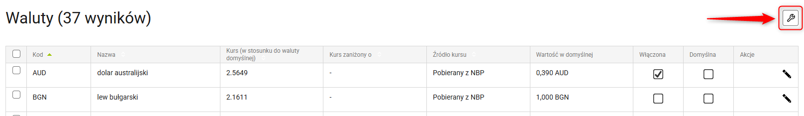 1. Przejdź do Administracja → Waluty i kliknij przycisk Ustawienia.