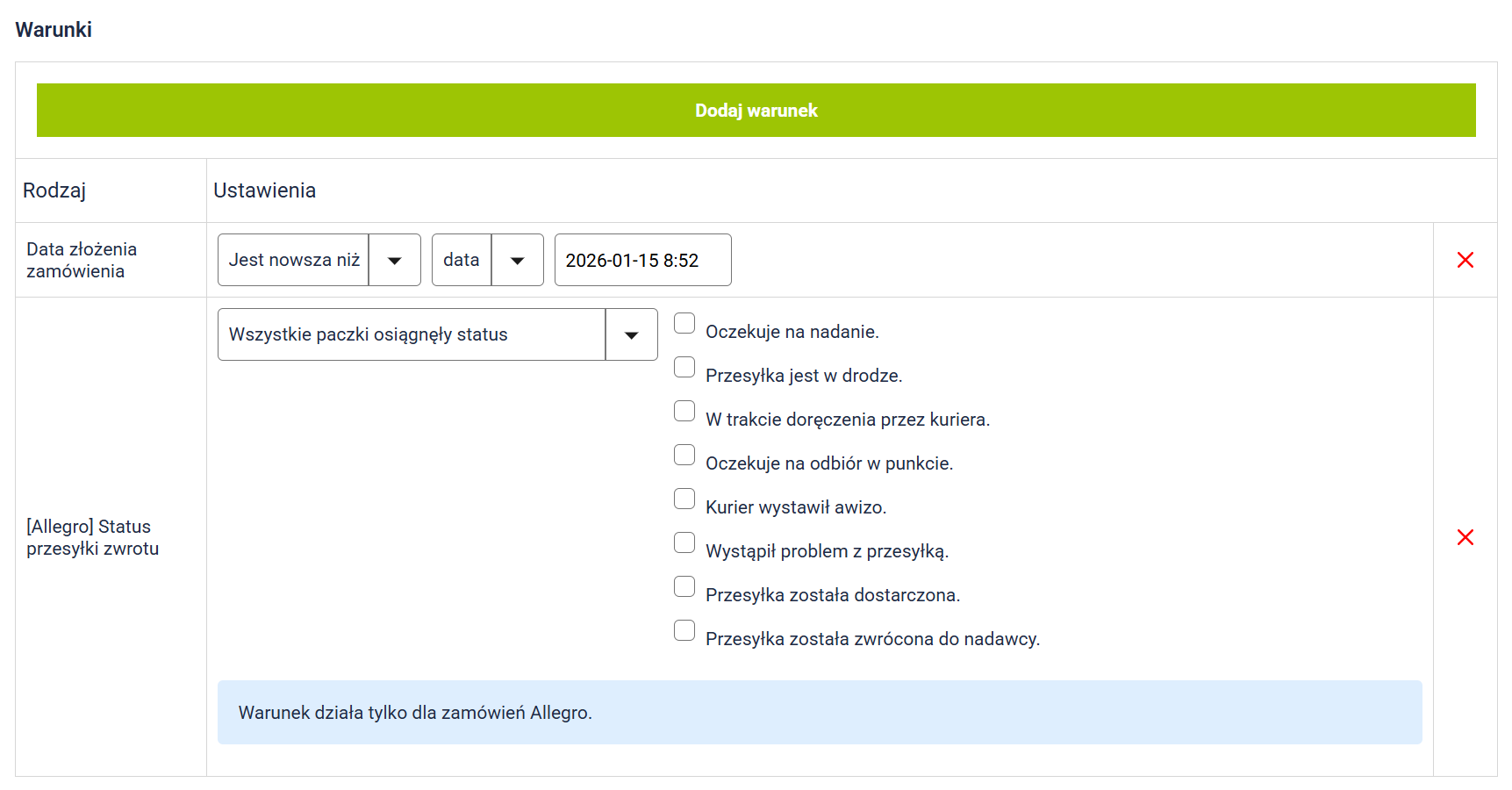 Warunek [Allegro] Status przesyłki zwrotnej umożliwia sprawdzenie, na jakim etapie znajduje się przesyłka ze zwrotem zamówienia Allegro (np. w drodze, odebrana). Na tej podstawie system może automatycznie wykonać kolejne działania — np. ustawić odpowiedni status czy rozpocząć dalsze procesy reklamacyjne.