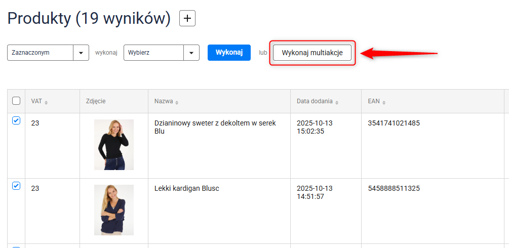 1. W panelu głównym przejdź do Asortyment → Produkty, zaznacz produkty, które chcesz zmodyfikować i kliknij przycisk Wykonaj multiakcje.