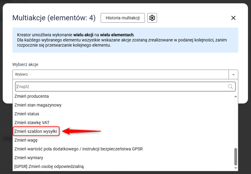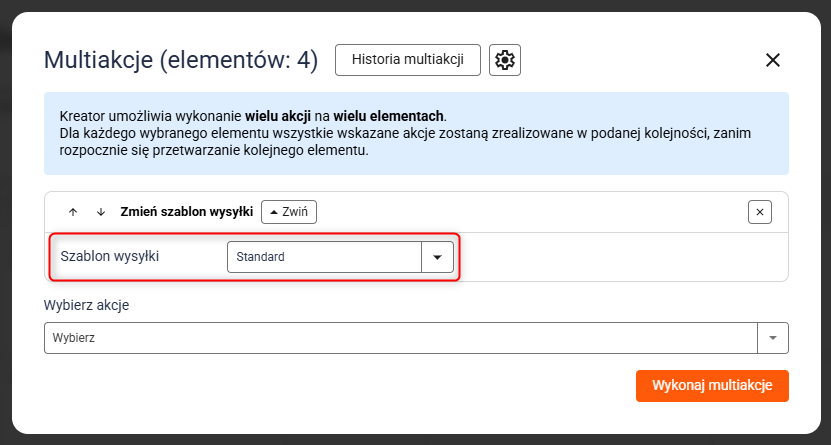 2. Wybierz z listy opcję Zmień szablon wysyłki, wybierz z listy odpowiedni szablon i kliknij przycisk Wykonaj multiakcje.