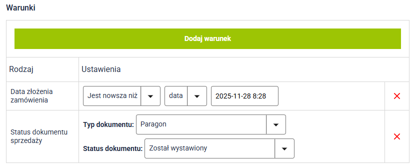 3. Najpierw w lewej kolumnie dodaj warunki, które muszą być spełnione, aby faktura została wysłana. Możesz dodać wiele warunków. Faktura będzie wysłana dopiero, kiedy zostaną spełnione wszystkie warunki. Na przykład, kiedy dokument ma być wysłany po wystawieniu. Kliknij Dodaj warunek. Wybierz z rozwijanej listy Status dokumentu sprzedaży, a następnie kliknij ok. Wybierz typ dokumentu Faktura i status dokumentu Został wystawiony.